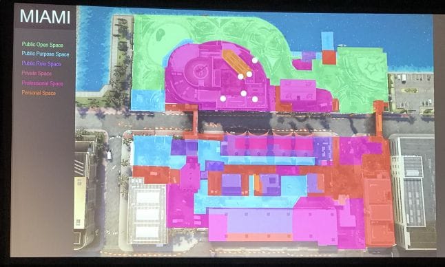 The language and sort of knowledge created by breaking down these spaces into different categories informed the design of Hitman 2, a game that features even larger levels and diverse social spaces than its predecessor. The map of Hitman 2’s first level, Miami, just below highlight both the size of the level itself, and the large public areas where players are more or less free to explore. “What we learned was that you can keep the player engaged without introducing trespassing,” she explains.