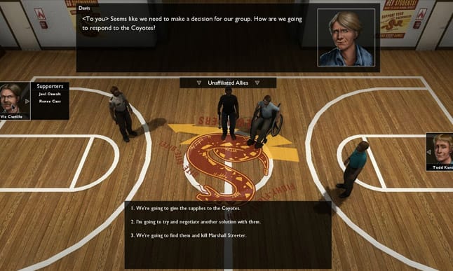 The biggest problem stemmed from our allies being around the shelter for a period of up to 85+ days of game time. There was definitely a player (and reviewer) expectation that the allies should have had dialogue refreshed nearly every day, or that they should have as much to say as companions in other RPGs. However, most RPGs spread their companion dialogue and reactivity over 8-10 companions or non-playable characters, and update it in stages according to a set of linear plot points (another thing that Dead State, by and large, happened to avoid).